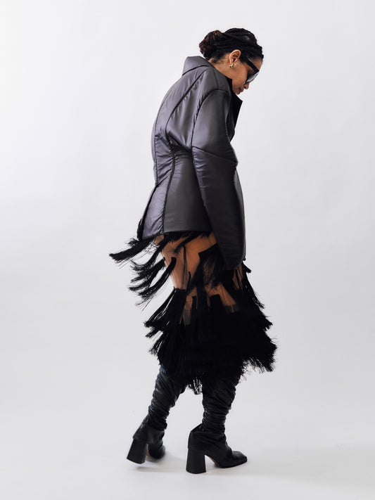 Designing within these constraints allowed me to challenge and redefine them, using construction and deconstruction to reshape the silhouette while still existing within the expected boundaries. I played with curves and draped lines, merging masculine and feminine elements to create a balance that feels both new and familiar.
