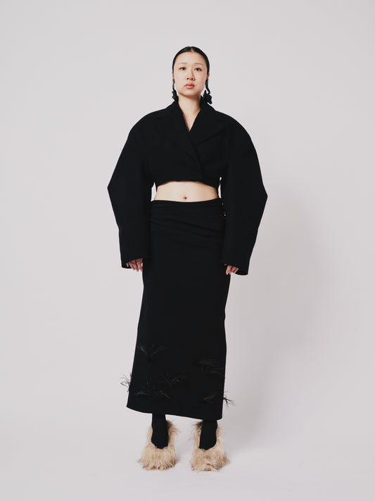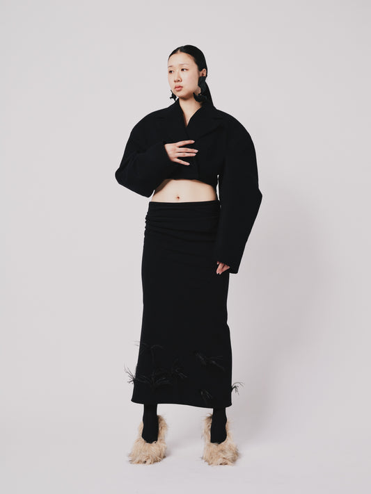 Structured Drape Skirt Black Wool Ostrich Feathers trim | ONE-OFF