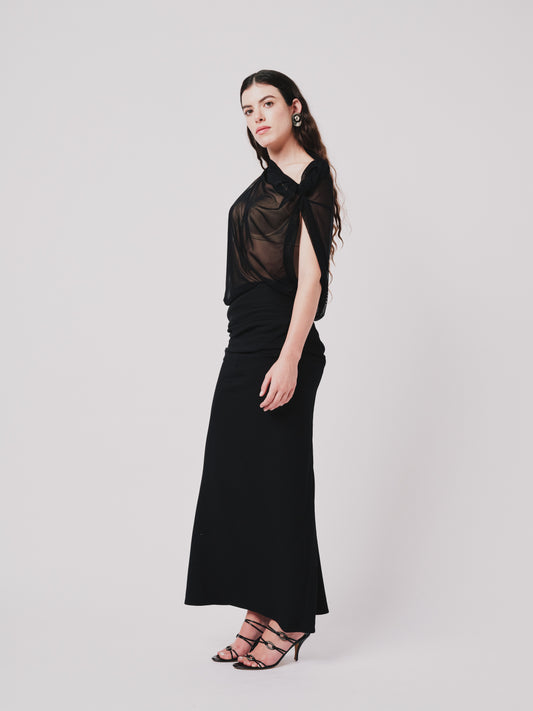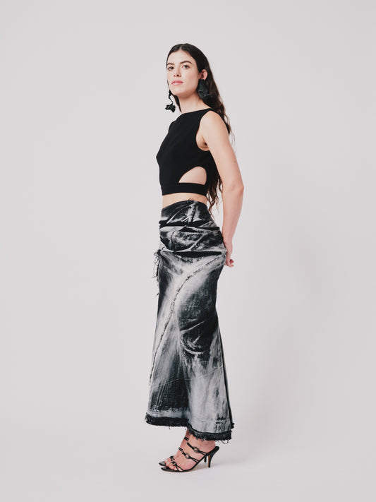 Structured Drape Skirt — Distressed Black Denim | PRE-ORDER