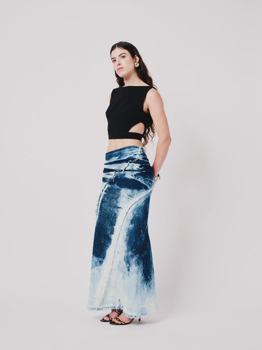 Structured Drape Skirt — Distressed Blue Denim | PRE-ORDER