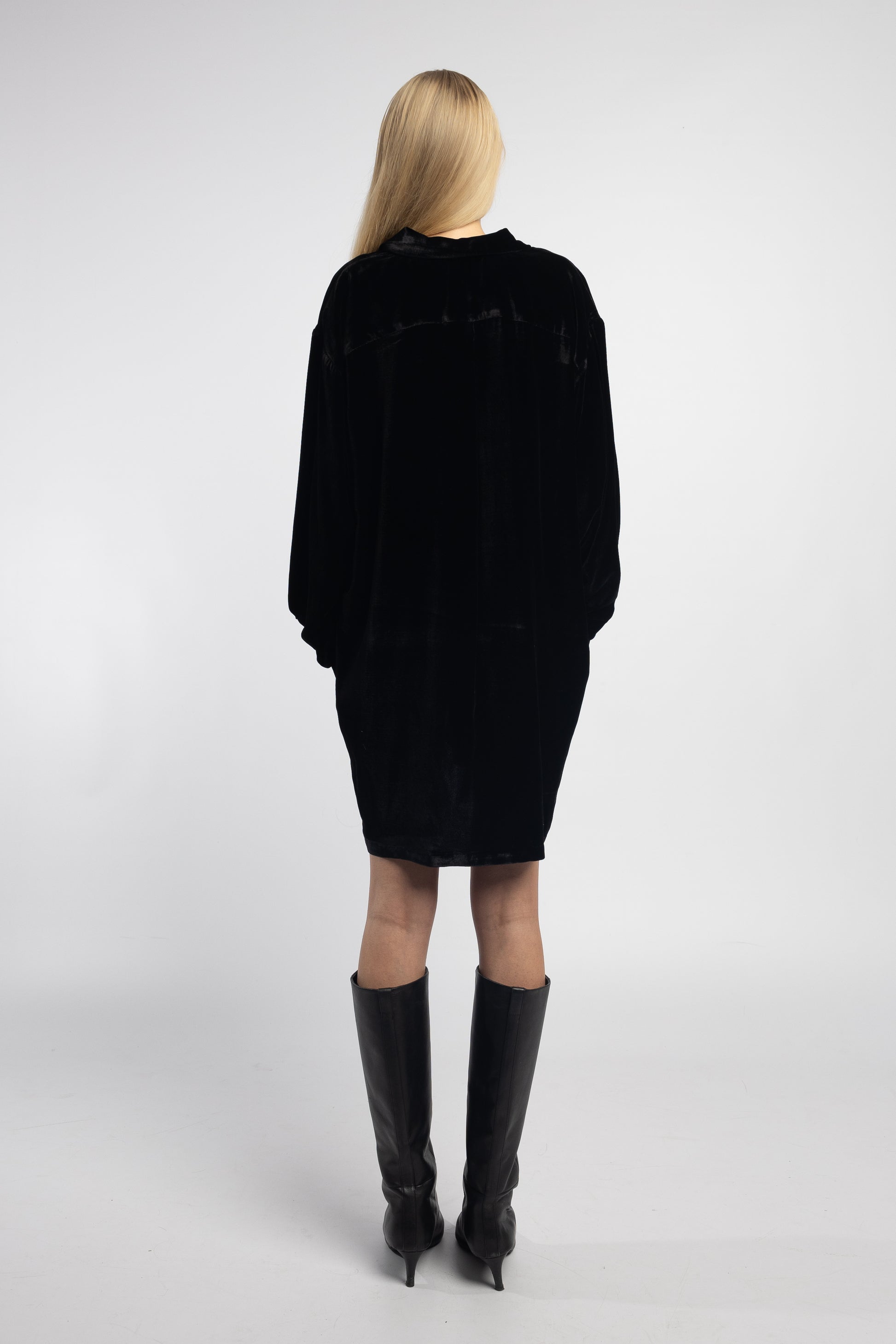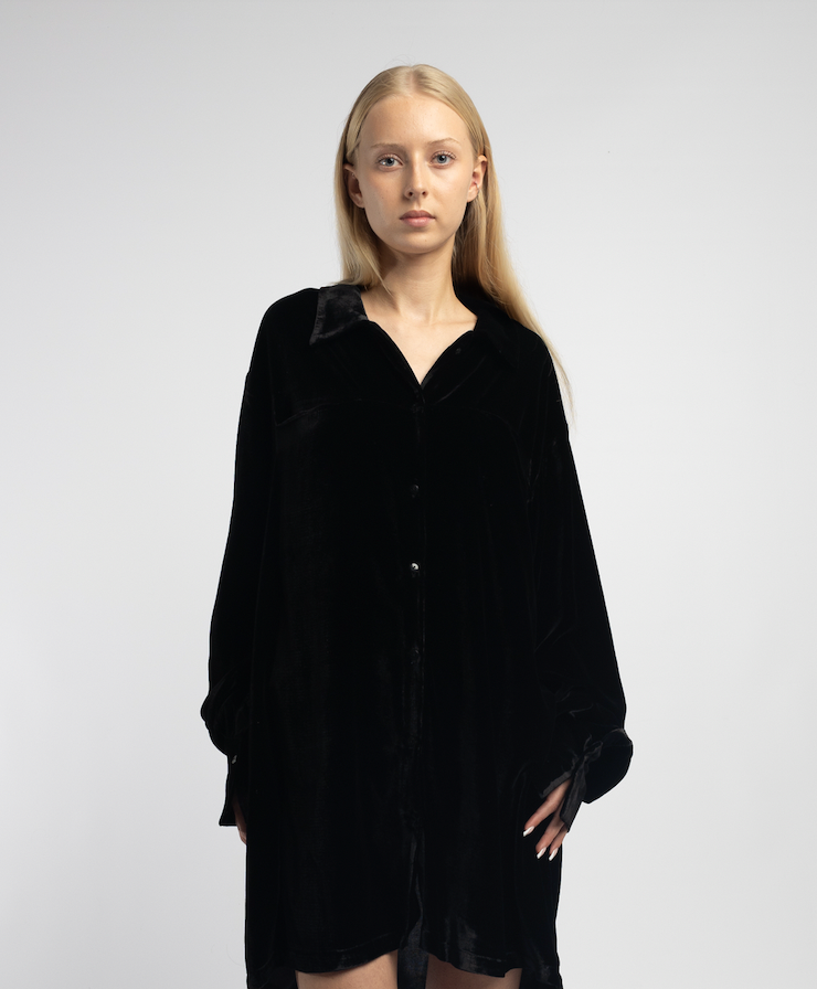 The Marq Shirt in Black Velvet offers a clean, architectural silhouette with a casual ease. The firm/drapey cotton velvet structure and oversized drape make it a versatile foundation for layering or styling on its own.