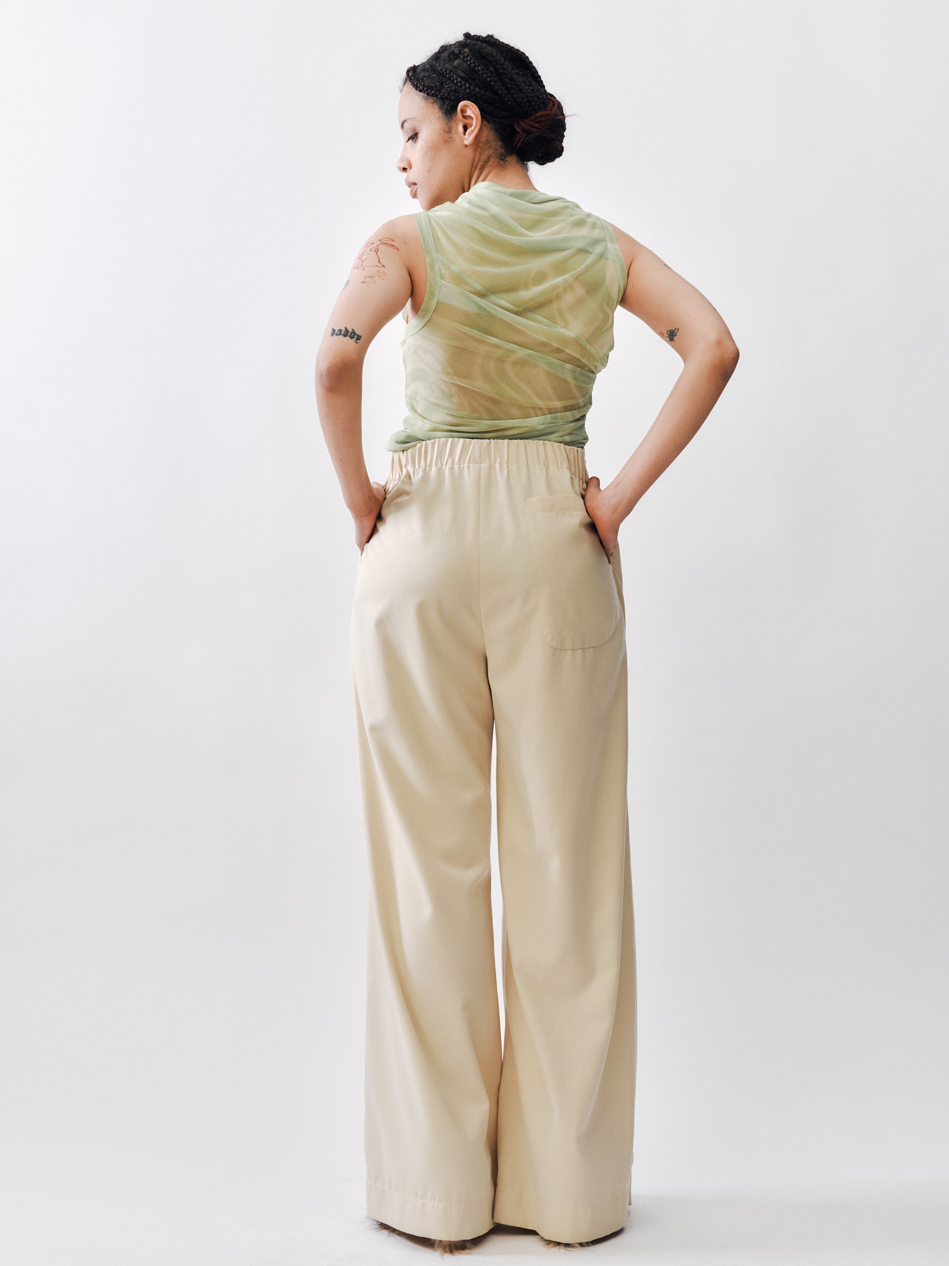 Introducing the Paloma Top - Matcha Latte Mesh, a true work of art inspired by a custom wedding dress. The top captures the fluidity and grace of marble sculptures, brought to life through meticulous hand draping techniques using Matcha Latte mesh fabric.